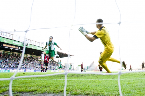 Matchen böljade fram och tillbaka, men det var Bajen som fick sista ordet i den första halvleken. Petter Furuseth Olsen, med bollen påhögerkanten, hittade Simon Helg med en perfekt krossboll. Helt fri till vänster i straffområdet spelar han in bollen där Linus Hallenius bara rakar in den (bilden ovan). 2-1 till Hammarby i halvtid!